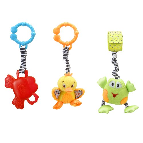 Fun to-go with a side of exploration. This set of three entertaining plush characters can go anywhere and each offers a fun feature! The duck features crinkle wings, the plush frog rattles, and the frog water-filled teether soothes baby’s gums. They easily attach to carriers, strollers, and more for use on-the-go.